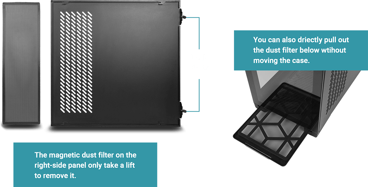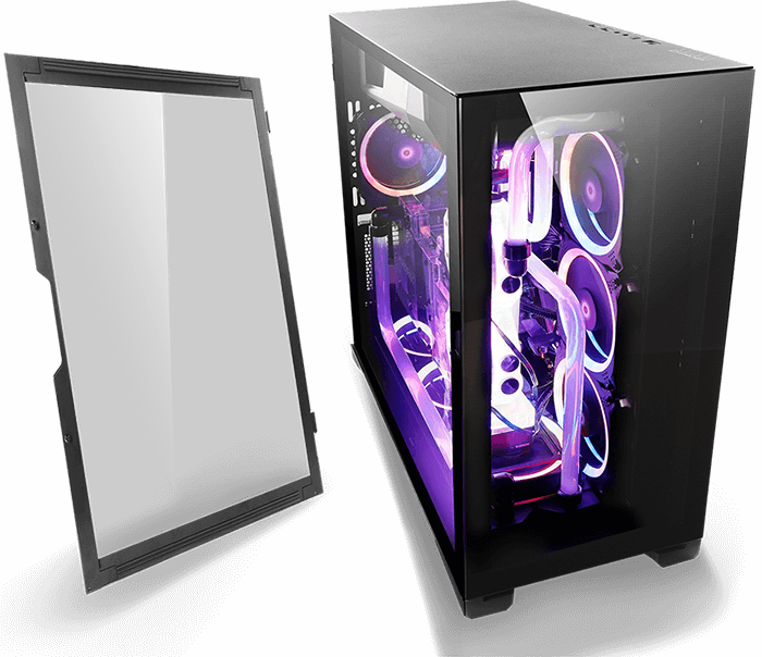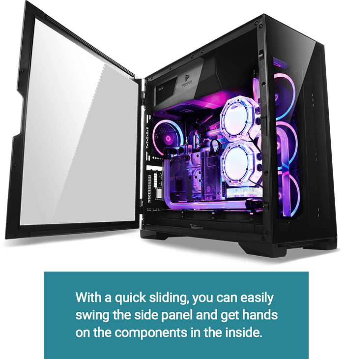 P120 Crystal comes with an industry-leading slide button design on the tempered glass side panel.