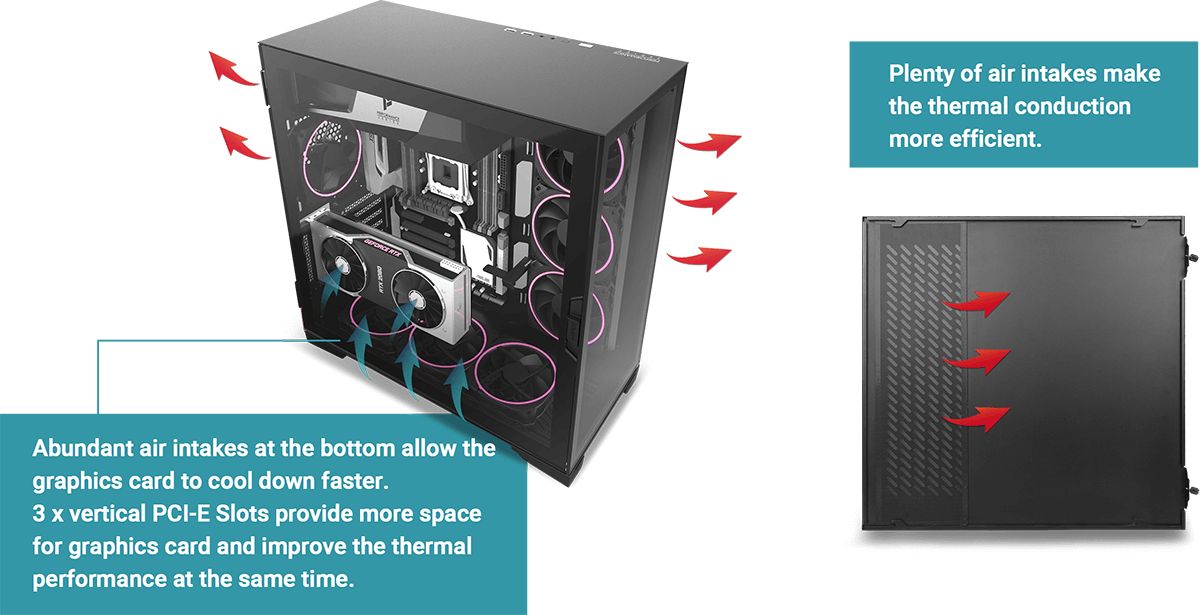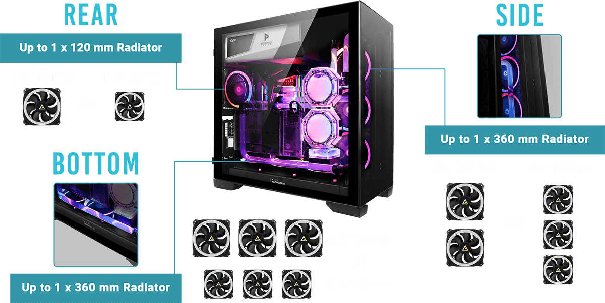 Supporting up to 7 x 120 mm or 6 x 140 mm fans, also crafted to mount 2 x 360 mm radiators simultaneously.