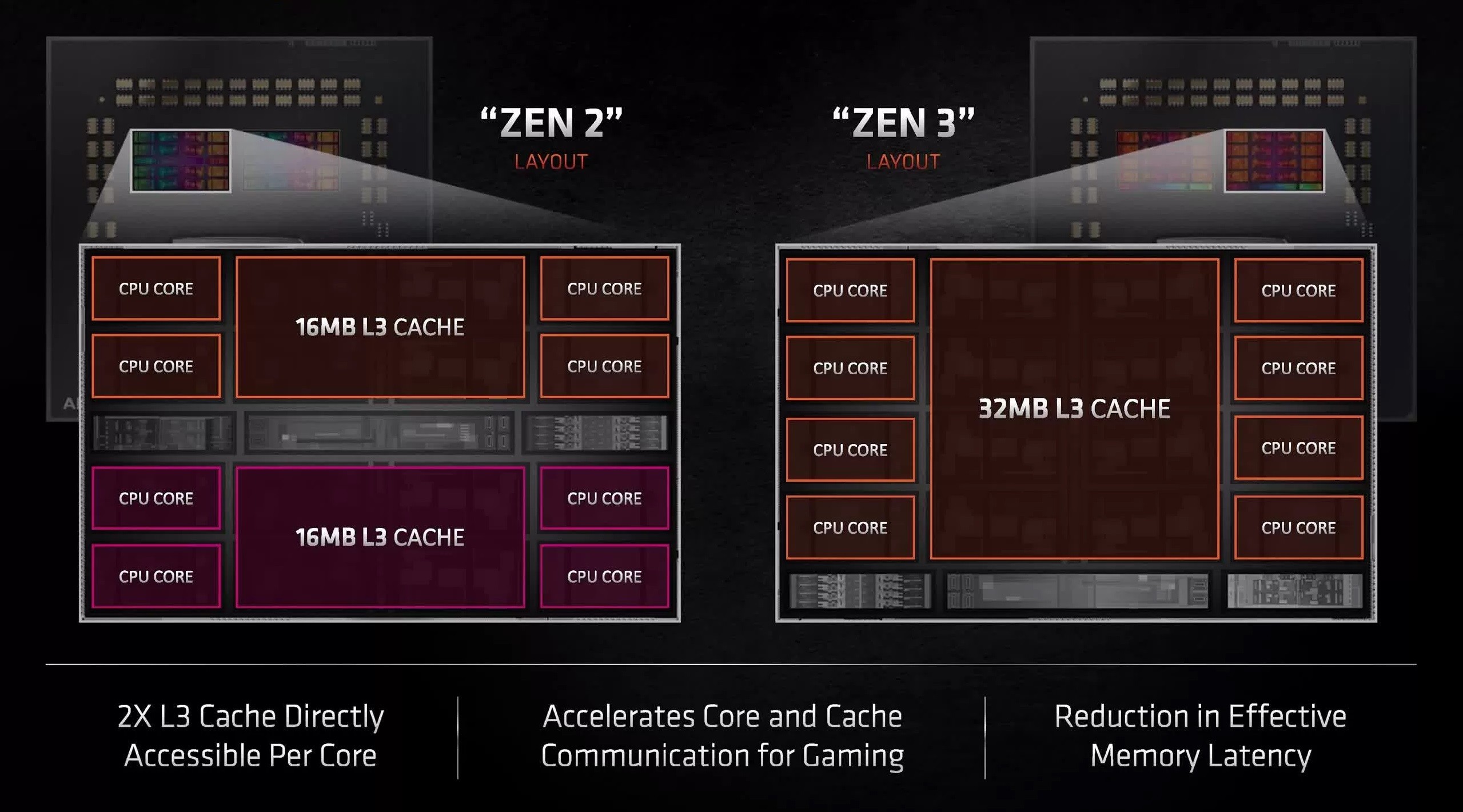 Với hai chiplet, Ryzen 9 5950X có đầy đủ 64 MB bộ nhớ đệm L3 được hợp nhất trong 2 cụm 32MB cho mỗi chiplet tám nhân (CCD)