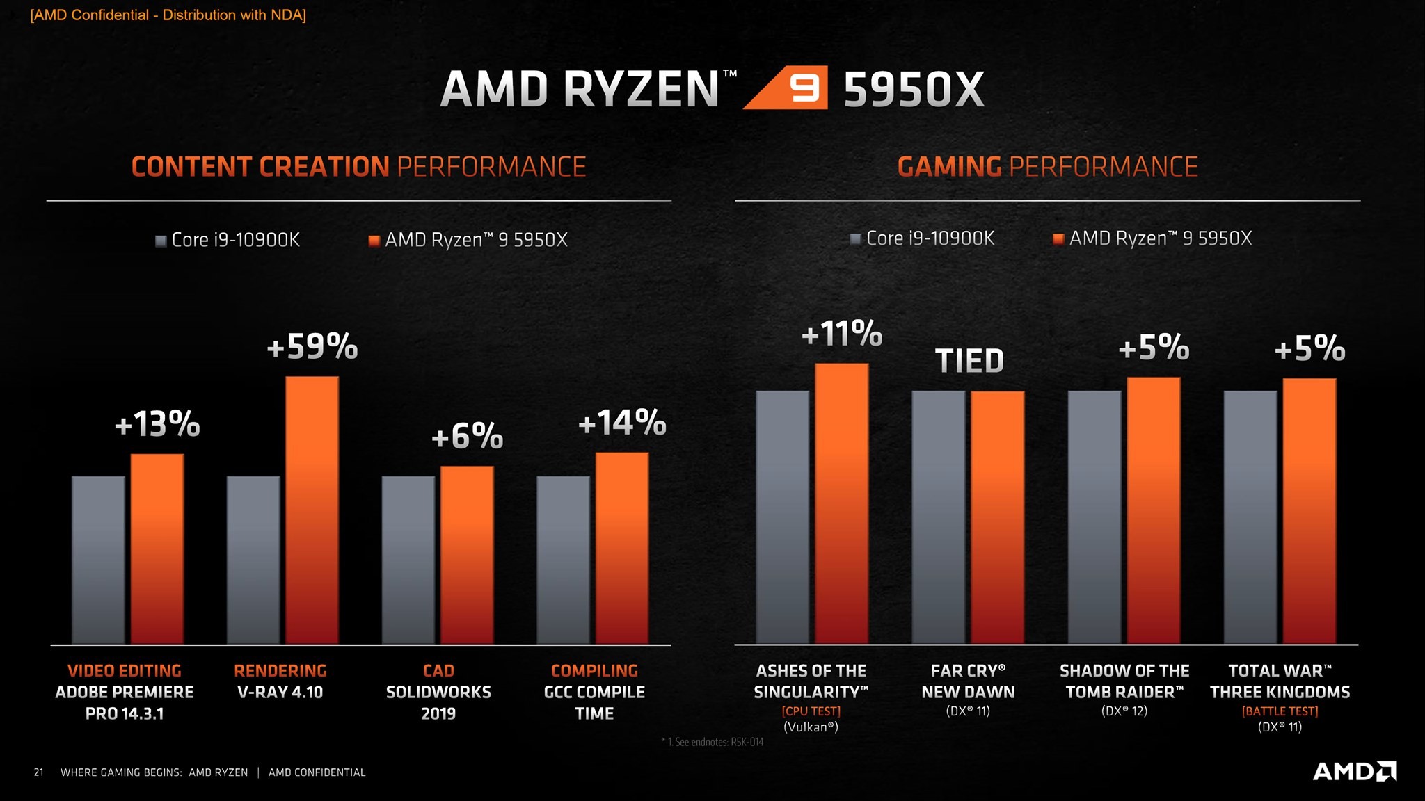 Ryzen 9 5950X được AMD giới thiệu với mức hiệu suất vượt trội khi so sánh với Ryzen 9 3950X đã được ra mắt cách đây khá lâu và CPU Core i9-10900K đầu bảng của Intel trong thời điểm hiện tại. Ryzen 9 5950X có hiệu suất vượt trội tới 29% khi so Ryzen 9 3950X. Khi sử dụng Adobe Premiere Pro, V-ray, Solidworks, GCC Compile Time, CPU Ryzen 9 5950X có hiệu suất cao hơn ít nhất là 5% và tối đa lên đến 27%.