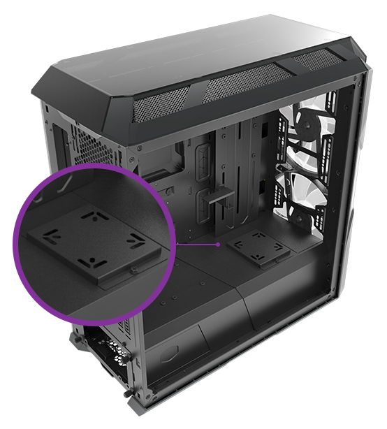 A dedicated water pump bracket offers mounting options directly atop the PSU shroud.