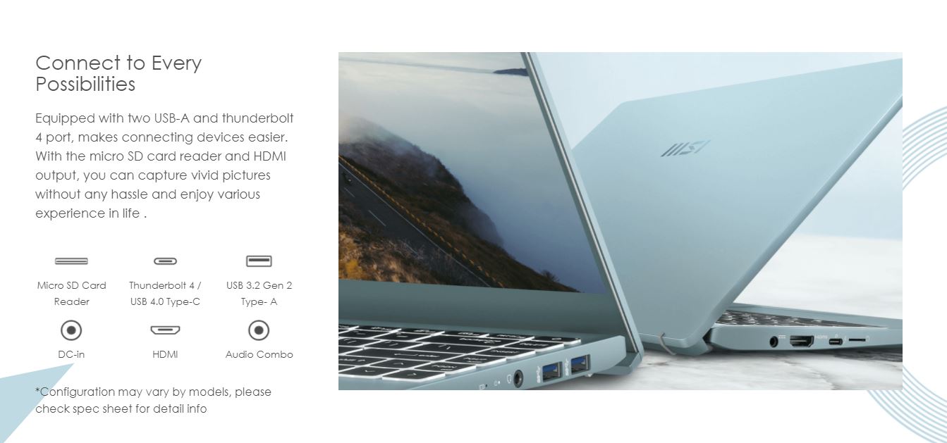Hướng đến những người hiện đại, thích sáng tạo nên MSI Modern 14 có đầy đủ các cổng kết nối. Cạnh trái gồm 1 cổng HDMI, 1 cổng USB-C và cổng sạc, cạnh phải gồm 2 cổng USB-A 3.2 gen 1, microSD và jack tai nghe 3.5mm. So với phiên bản Ryzen, MSI Modern 14 B11M đã nâng cấp chuẩn USB từ 2.0 lên 3.2 Gen 1 nên có tốc độ truyền tải nhanh hơn.