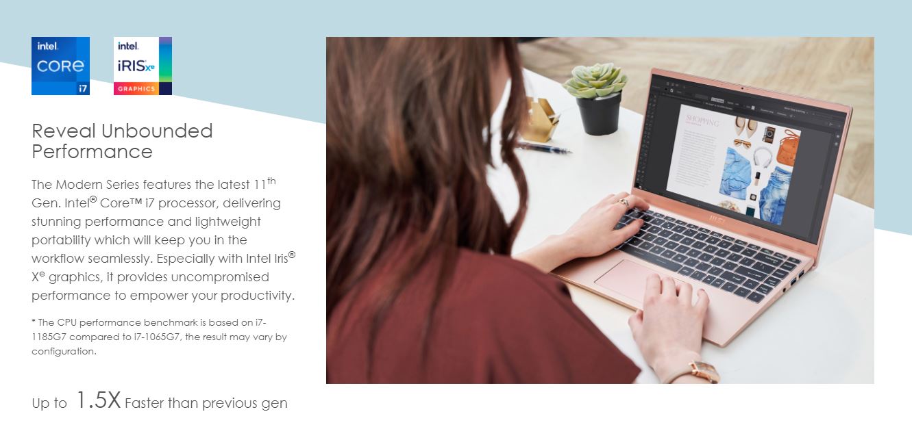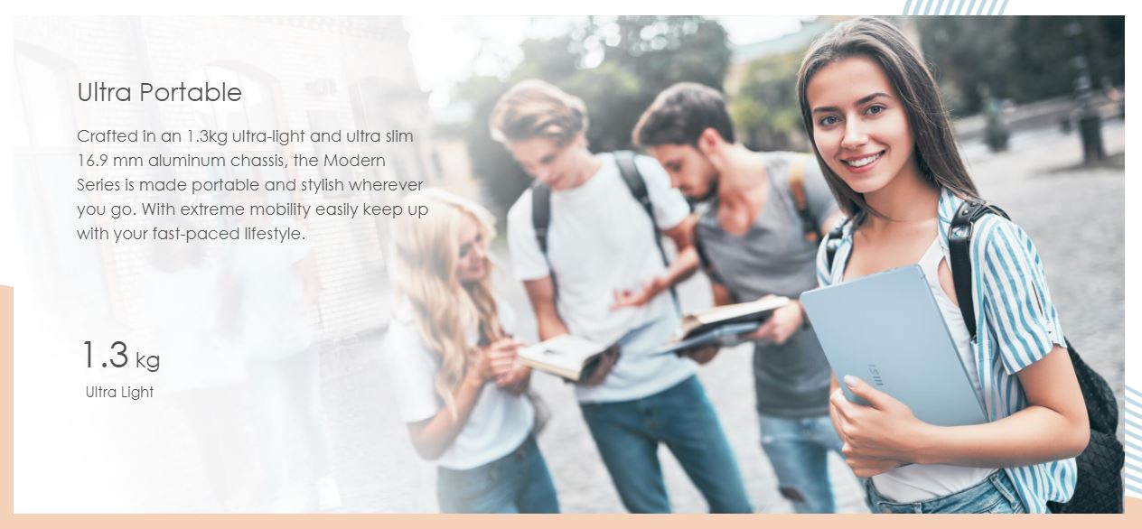 Cuối năm 2020, MSI công bố ra mắt dòng máy tính MSI Modern 14 Gen 11th với nhiều cải tiến so với người đàn em gen 10th. Mordern 14 được đánh giá là mẫu laptop có hiệu năng cực cao khi trang bị CPU Intel 11th và có thiết kế sang trọng, nhỏ gọn tăng tính cơ động và có thời lượng pin "trâu" sẽ rất phù hợp với giới doanh nhân, những bạn trẻ đam mê sáng tạo, thích sự năng động. Sự kết hợp hoàn hảo của nó khiến cho công việc, học tập hàng ngày trở nên đơn giản hơn bao giờ hết.