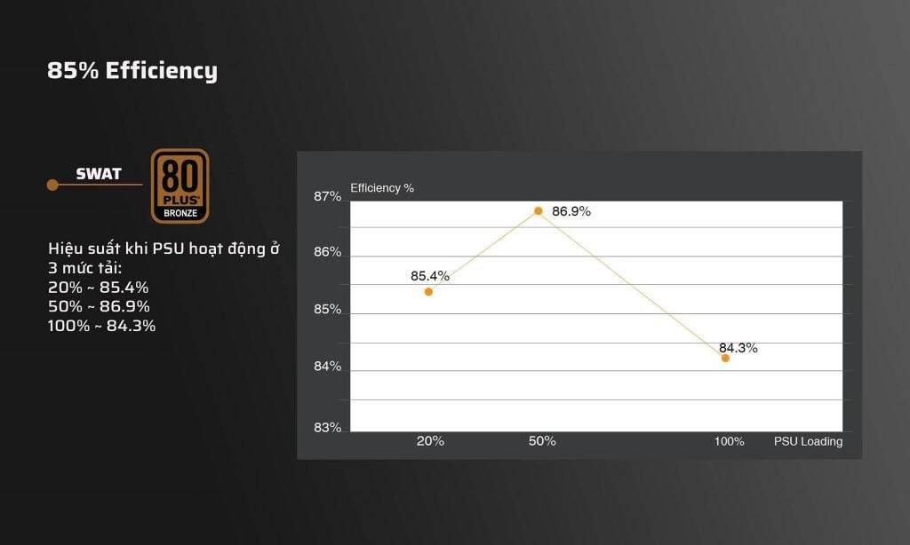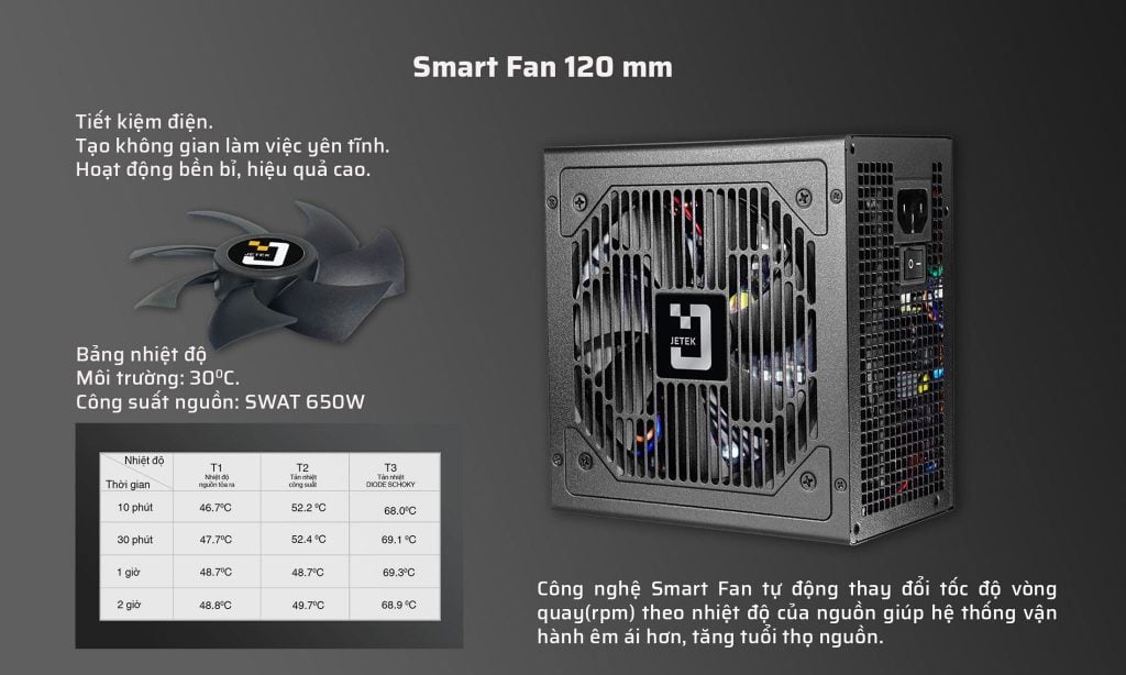 Để làm được như vậy, nhiệt độ đã được hãng coi trọng cho dòng sản phẩm SWAT cụ thể là JETEK SWAT 650- 650W - 80 Plus Bronze được nâng cấp hệ thống tản nhiệt với cảm biết nhiệt thông minh giúp quạt trang bị Smart Fan 120mm được điều khiển liên tục chạy khi hệ thống làm việc nặng, điều này cũng giúp cho linh kiện bên trong được đảm bảo an toàn không bị trong quá trình vận hành.