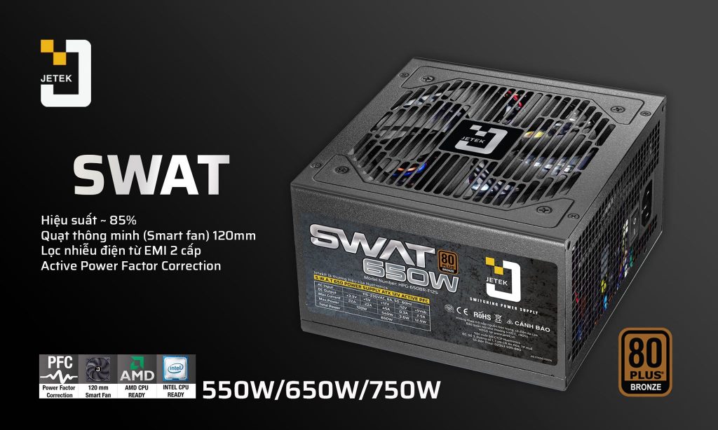 Nguồn JETEK SWAT 650- 650W - 80 Plus Bronze là dòng sản phẩm mới đến từ thương hiệu JETEK, điểm khiến đây trở thành lựa chọn mới thay thế các sản phẩm phổ thông có công suất 650W chính là việc bộ nguồn này có thể đáp ứng đầy đủ tất cả công việc như render đồ họa, gaming