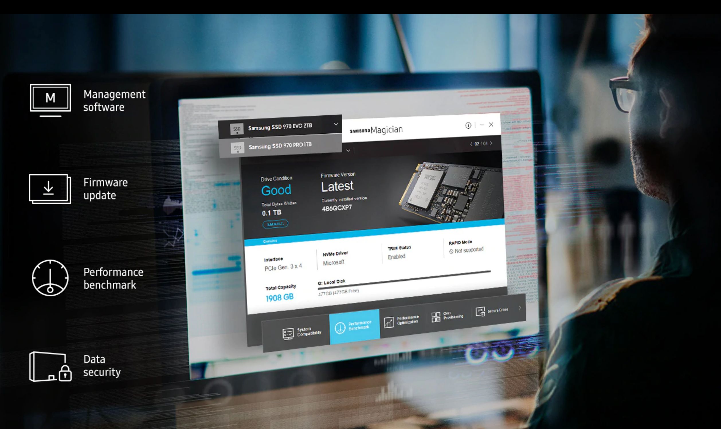 Việc sử dụng ổ cứng sẽ ngày càng đơn giản với mọi người hơn khi mà có sự giúp sức của Samsung Magician. Phần mềm giúp người dùng có thể theo dõi được thông số ổ cứng đang sử dụng như dung lượng, TBW còn lại …. Với giao diện thân thiện, dễ sử dụng Samsung Magician sẽ giúp người dùng tự động update, quản lý hiệu năng, độ bền của SSD và cả tăng tốc độ truyền dữ liệu lên.