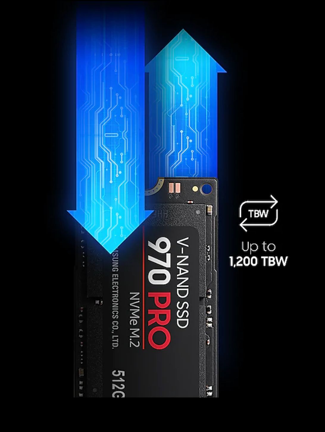 Dòng sản phẩm SSD Samsung 970 PRO không hỗ trợ dung lượng 128 GB, 256 GB, Nhờ sự phát triển của giao thức PCIe Gen 3×4 NVMe mang đến dung lượng lưu trữ 512GB, với thiết kế nhỏ gọn giúp mở rộng dung lượng lưu trữ dữ liệu cũng như không gian bên trong của máy tính. Do đó Samsung cho phép người dùng có thêm dung lượng lưu trữ để làm việc hiệu quả hơn.