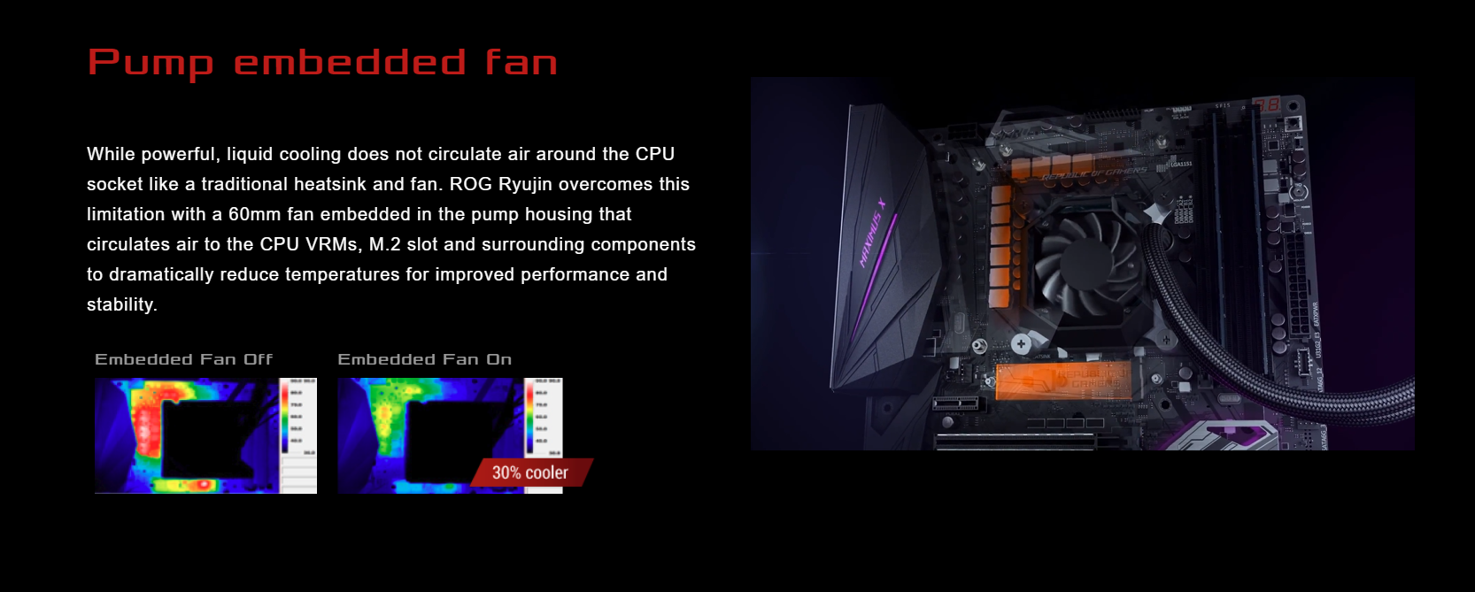 Ngoài làm mát CPU, ROG Ryujin còn cung cấp khả năng giải nhiệt cho phần tụ, điện, IC, VRM của mainboard và ssd m2. Tích hợp bên dưới phần bơm là 1 quạt 60mm tăng cường hiệu năng và độ ổn định cho các linh kiện xung quanh.
