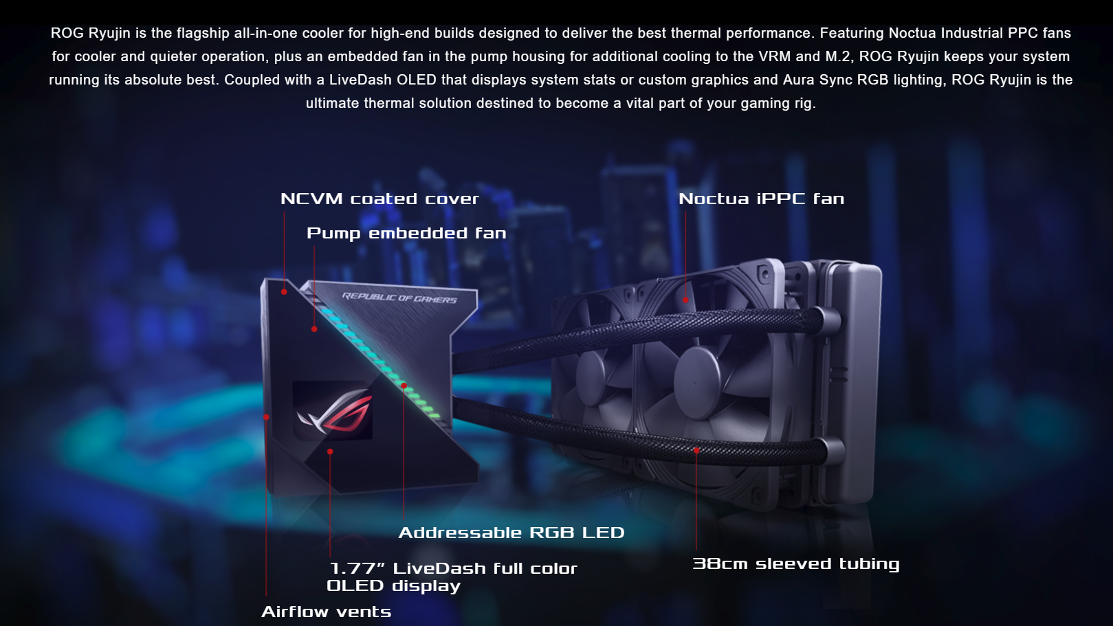 ROG Ryujin 240 all-in-one. Tản nhiệt chất lỏng với màn hình màu OLED, Aura Sync RGB, 2 quạt 120mm Noctua iPPC 2000PWM chuyên thổi radiator Màn hình màu OLED 1.77 inch cung cấp thông tin tình trạng hệ thống hoặc tuỳ chỉnh logo, hình động Tích hợp quạt mini bên trong phần Block và bơm Thiết kế quạt Noctua iPPC 2000PWM đến từ thương hiệu tản nhiệt nổi tiếng hàng đầu thế giới đem đến áp suất gió lớn Phần mềm LiveDash one-stop control center tuỳ chỉnh hiệu ứng ánh sáng và màn hình OLED Thiết kế nắp đậy phần bơm với đèn addressable RGB được mạ chân không đem đến cảm giác sang trọng, cứng cáp. Phong cách thiết kế đồng bộ với các linh kiện của ASUS ROG, đem lại ấn tượng ngay phần chính giữa của bộ máy. Dây dẫn nước được bện tăng cường tuổi thọ cho linh kiện.