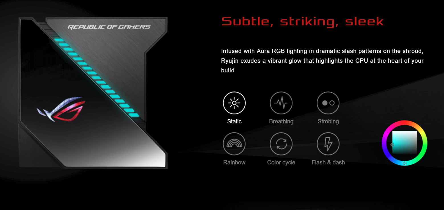 Tinh tế, nổi bật, kiểu dáng đẹp Với đèn Aura RGB, khu vực vi xử lý sẽ nổi bật hơn với vai trò là đầu não của cả hệ thống. Cung cấp vô vàn hiệu ứng chuyển màu, ROG Ryujinyu sẽ đảm bảo PC của bạn sẽ luôn nổi bật.