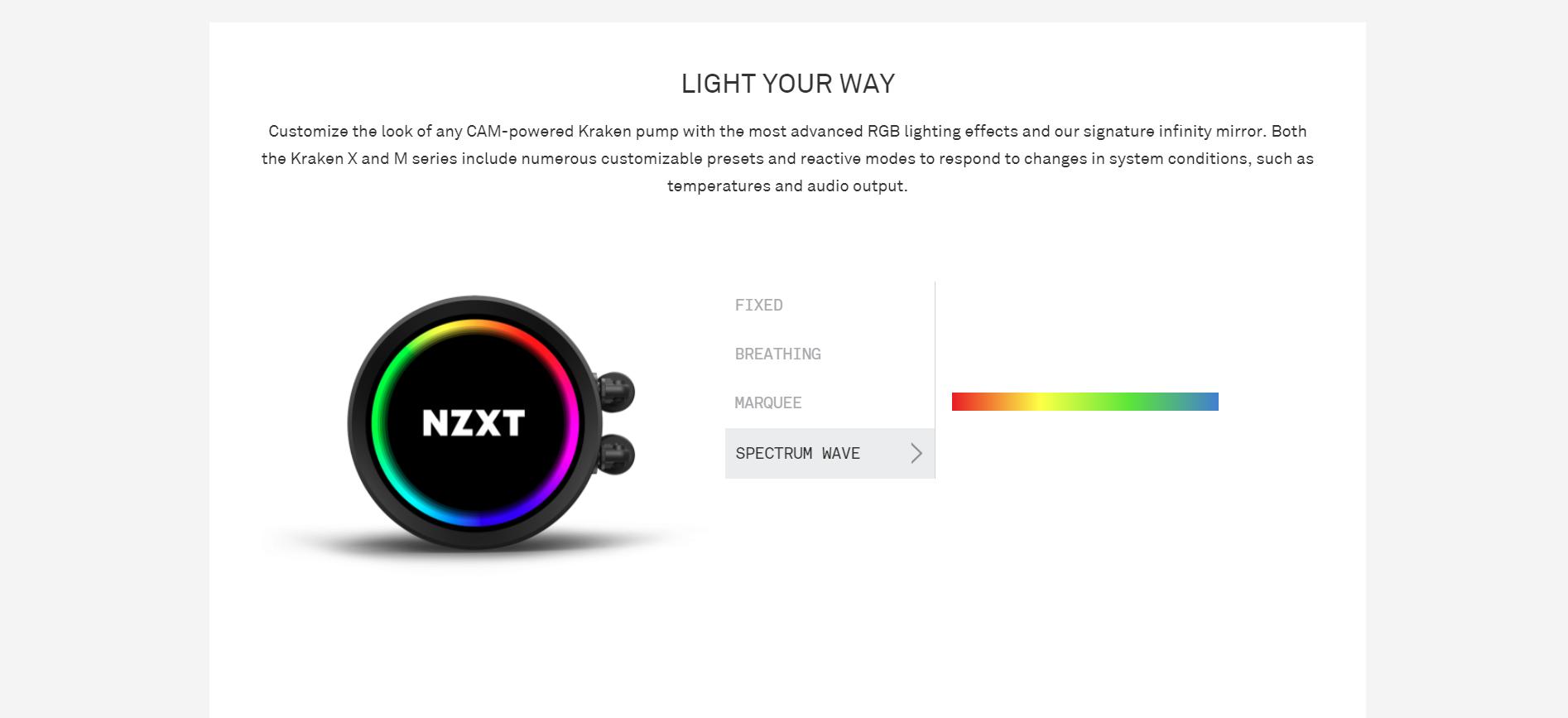 Phần mềm CAM đem tới một giao diện thân thiện hơn cho người dùng, tuỳ chỉnh hiệu năng chỉ cần thông qua một cú click chuột. Ở series Kraken mới, Tản nhiệt đã đi kèm khả nằng điều chỉnh đèn Led RGB cho các thiết bị khác bao gồm Led Strip và quạt RGB của hãng.