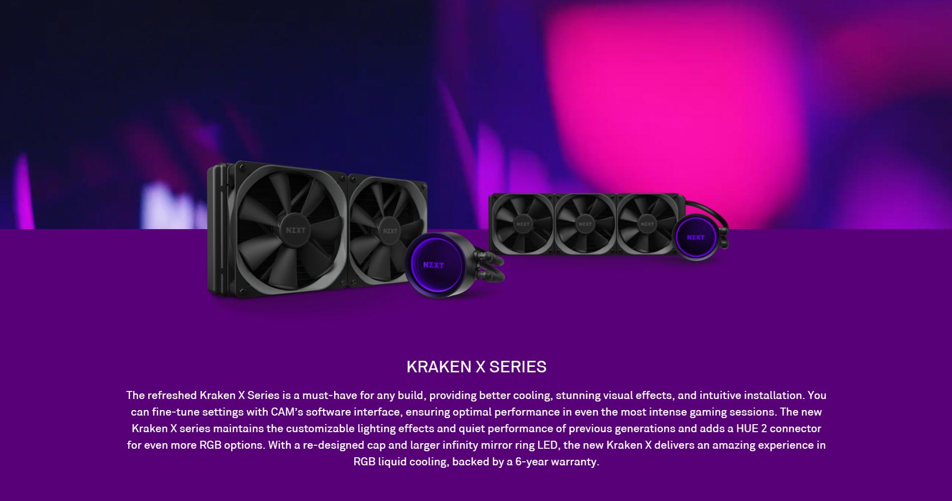 Series Kraken X mới có thể coi là một phần thiết yếu cho các bộ máy, sản phẩm đem tới hiệu năng tản nhiệt tốt hơn, các hiệu ứng ánh sáng độc đáo. Bạn có thể tuỳ chỉnh các tuỳ chọn thông qua phần mềm CAM. Dòng sản phẩm mới mang tới sự tuỳ biến cao về ngoại hình, khả năng đồng bộ tuỳ chỉnh màu sắc với cổng kết nối HUE 2 tích hợp sẵn. Phần nắp đã được thiết kế lại, nay vòng led vô cực đã được lớn hơn và có thể xoay được tự do, Kraken X chắc chắn sẽ đem tới cho người dùng trải nhiệm tuyệt vời tản nhiệt nước trang bị đèn RGB.